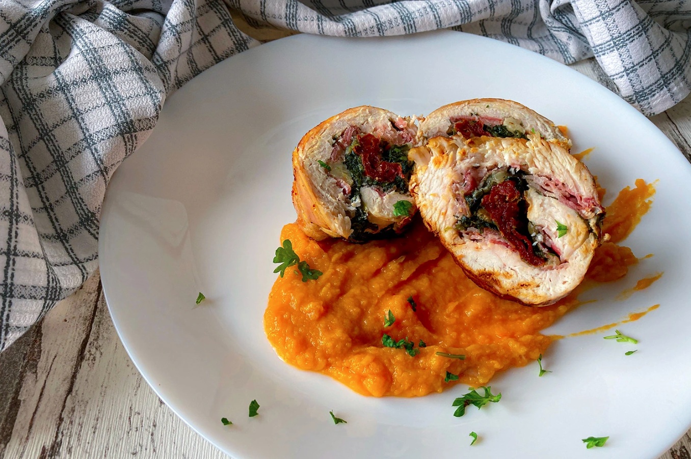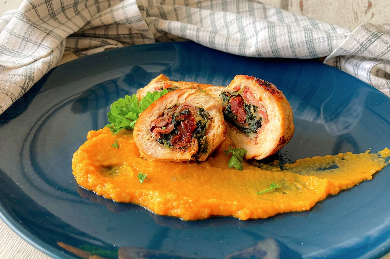 KUHINJA.COM | Piščančja rolada s panceto, špinačo in kremo iz sladkega krompirja ...