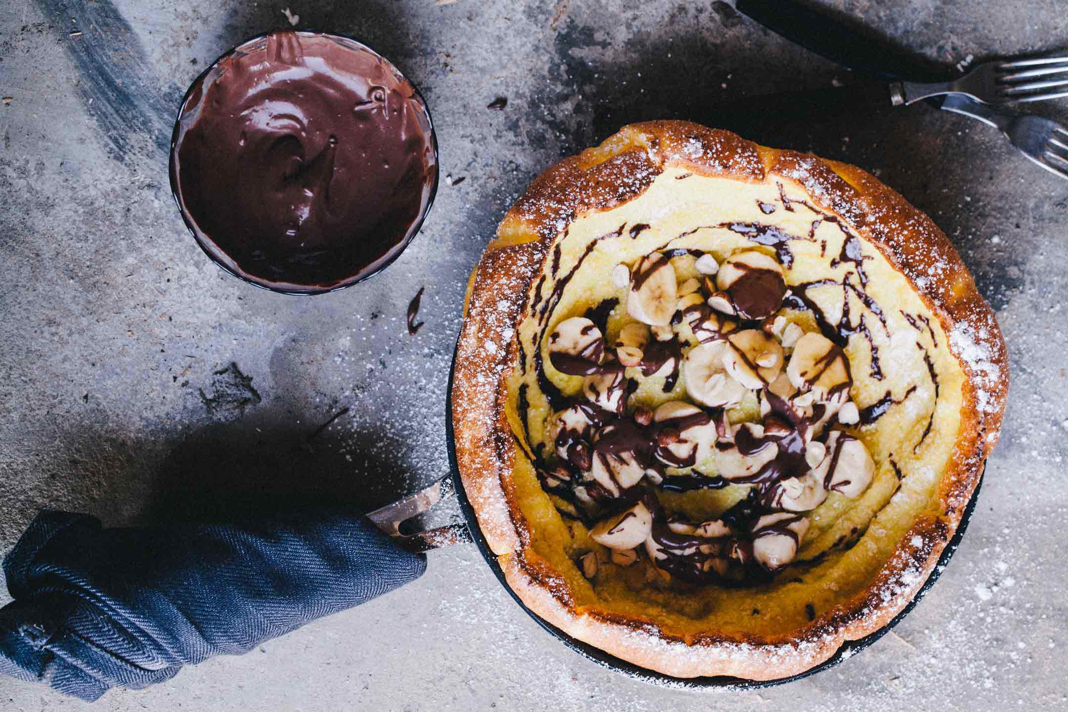 Nemško palačinko postrežemo takoj. Posujemo jo s sladkorjem v prahu. Olupimo in narežemo banani, koščke razporedimo po centru palačinke. Dodamo še sesekljane lešnike in stopljeno čokolado.