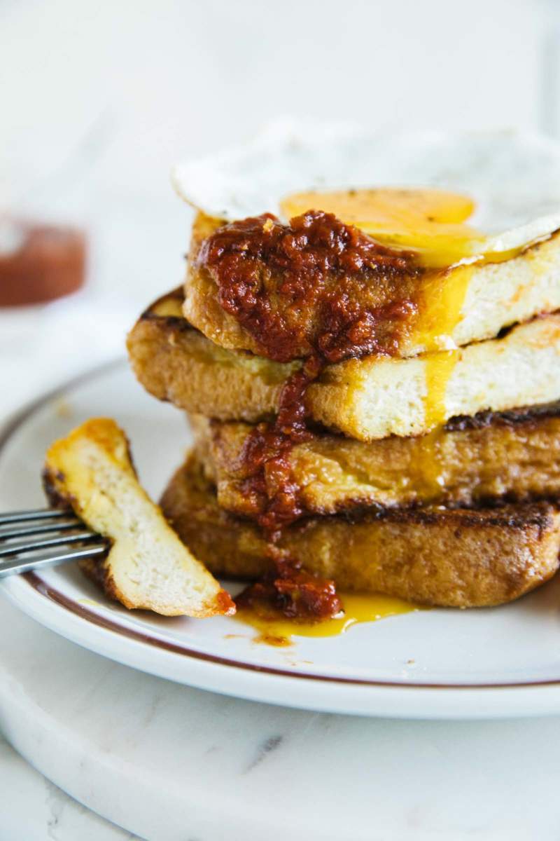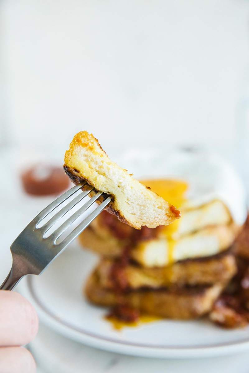 V skledi razžvrkljamo jajca, mleko in sladko smetano. Solimo in popramo. Ponev pristavimo na srednje močan ogenj. V vročo ponev dodamo rastlinsko olje in maslo. Vsako rezino kruha posebej potopimo v jajčno mešanico. Kruh z vilico rahlo napikamo, da se napije jajčne mešanice. Kruh dvignemo z lopatico nad skledo da se odvečna jajčna mešanica odcedi, nato kruh prestavimo v ponev z maščobo in ga na vsaki strani opečemo, približno 3-4 minute na vsaki strani. Pečemo po dva kruha naenkrat.