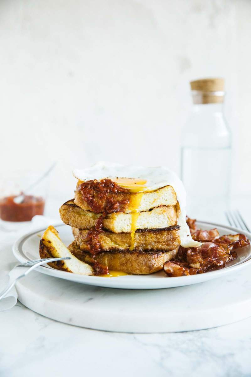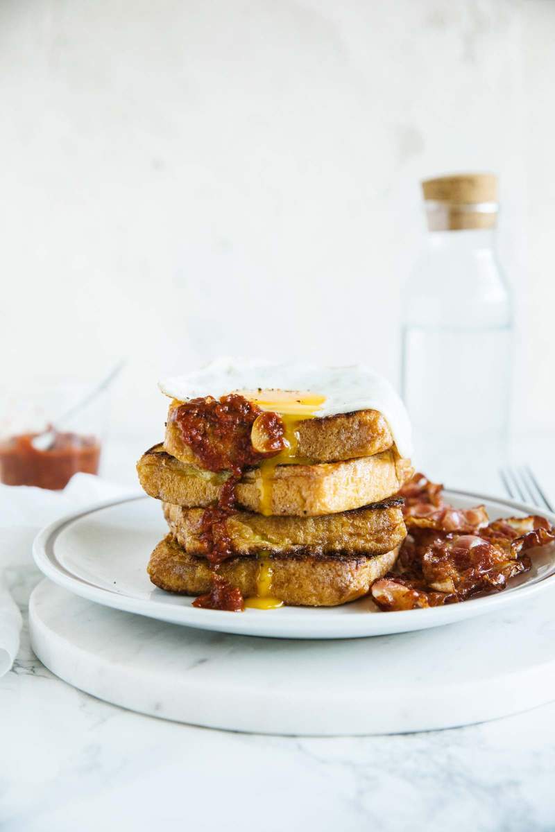 Ko je kruh pečen, ga prestavimo na pladenj, obložen s kuhinjskimi brisačkami. Slanino v ponvi popečemo. Kruh razdelimo med štiri krožnike, dodamo poljubno količino slanine in žličko omake. Poljubno postrežemo z jajcem na oko.