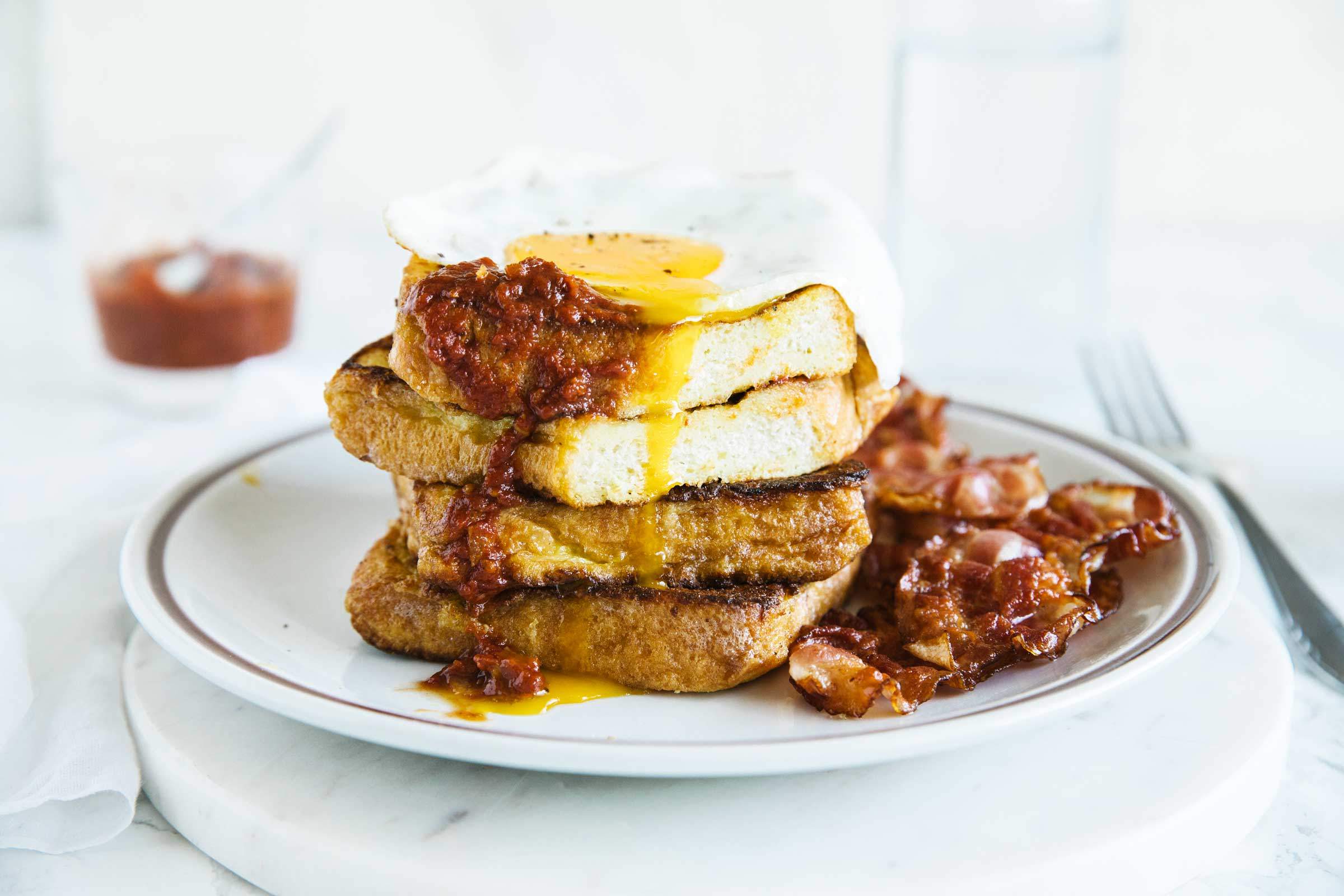 4 jajca 80 ml mleka 50 ml sladke smetane 2 žlici rastlinskega olja 10 g masla 4 rezine belega mlečnega kruha (2 cm debele rezine) 8 rezin kvalitetne slanine