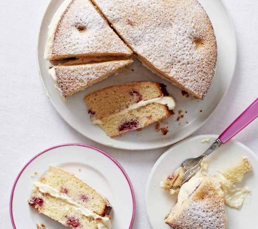 Zmes previdno vlijemo v modla in pečemo 20 do 25 minut, da postane testo zlato rjavo. Nato naredimo test z zobotrebcem, da se prepričamo, ali je testo pečeno. Z zobotrebcem prebodemo testo, in če ostane čist, je sladica pečena (maline lahko pustijo sled, saj so sočne). Biskvita vzamemo iz pečice in ju še 10 minut pustimo v modlih, da se ohladita. Potem ju zvrnemo na rešetko, da se dokončno ohladita.