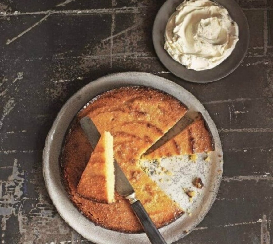 2 neškropljeni limoni 140 g zmehčanega masla 3 jajca 200 g rjavega sladkorja 200 g mletih mandljev 175 g koruznega zdroba 1 žlička pecilnega praška maslo za model maskarpone ali sladka smetana, ko postrežemo