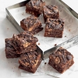 Pečico segrejemo na 180 °C. Z maslom namažemo kvadraten pekač s stranicami 23 cm in ga obložimo s papirjem za peko. V srednje veliki kozici stopimo maslo, vanj nalomimo vso čokolado, odstavimo in počakamo, da se čokolada stopi.