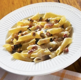 Medtem testenine v osoljeni vodi skuhamo al dente in jih odcedimo. Zmešamo jih z omako, dodamo parmezan in peteršilj, vse še enkrat dobro premešamo in takoj postrežemo.