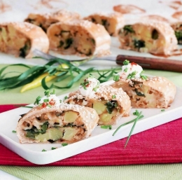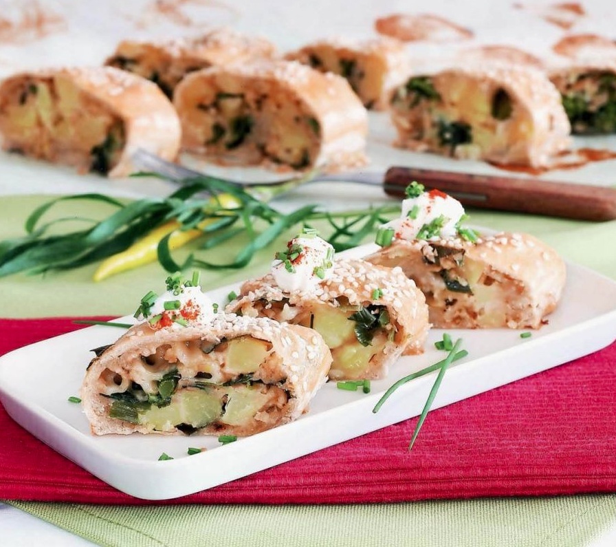 Nadevano testo zvijemo v zavitek, premažemo z mlekom, potresemo s sezamom in pečemo v pečici pri 180 °C približno 25 minut. K zavitku lahko ponudimo poljubno hladno omako.