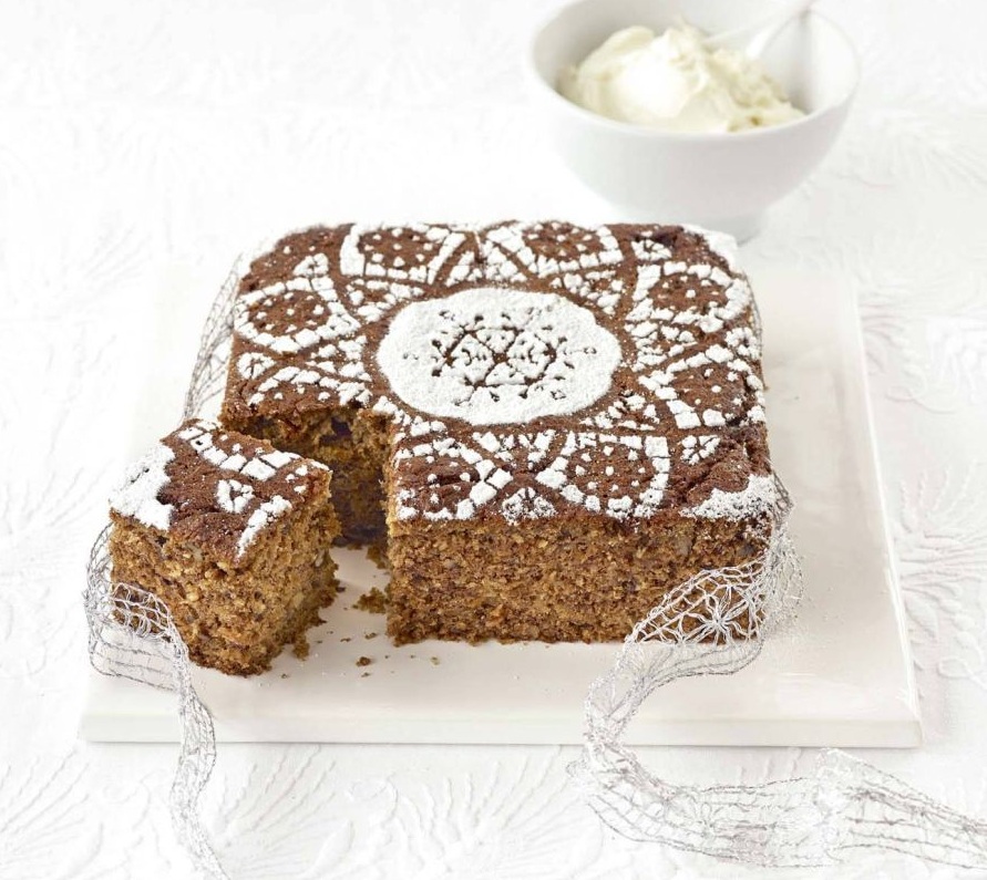 Ko želimo kolač postreči, ga položimo na servirni pladenj, tako da je »prava« stran zgoraj. Na vrh kolača položimo enega ali več prtičkov in obilno posipamo s sladkorjem v prahu, nato prtičke previdno odstranimo, da ne uničimo vzorčka. Postrežemo takoj, saj se bo začel sladkor čez nekaj časa topiti. Zraven ponudimo kakšno kremo – lahko recimo zmešamo enaki količini sira maskarpone in jogurta ter osladimo s sladkorjem v prahu.