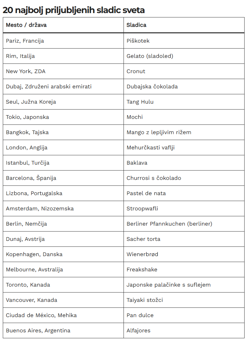 Pravzaprav so sladice pogosto enako prepoznavne kot znamenitosti posameznega mesta – tako kot Eifflov stolp v Parizu ali Kolosej v Rimu. Če potujete in radi okušate lokalne specialitete, vas bo morda zanimalo, katere sladkarije se najpogosteje znajdejo na seznamih najbolj priljubljenih.