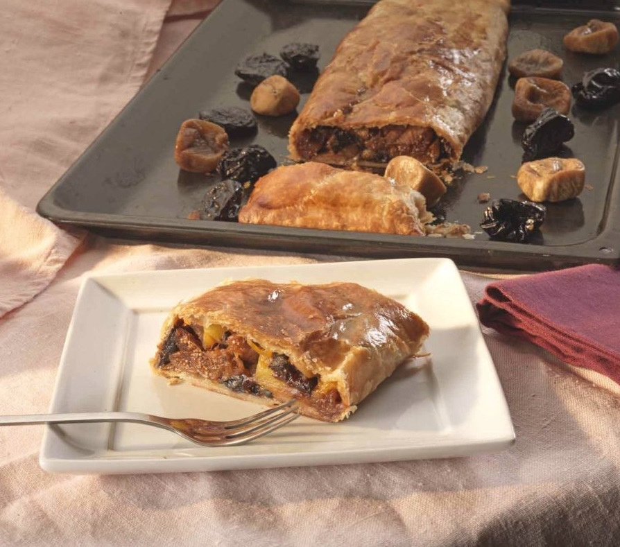 Dobro ohlajeno testo razvaljamo na rahlo pomokani delovni površini 2 do 3 mm debelo v pravokotnik (dolžina naj ustreza velikosti pekača). Premažemo ga z maslom in na testo razporedimo nadev. Testo ob straneh zavihamo navznoter, zvijemo v zavitek in ga tudi na zunanji strani namažemo z maslom. Zavitek s suhim sadjem pečemo 20 do 25 minut v pečici, ki smo jo predhodno segreli na 180 °C.