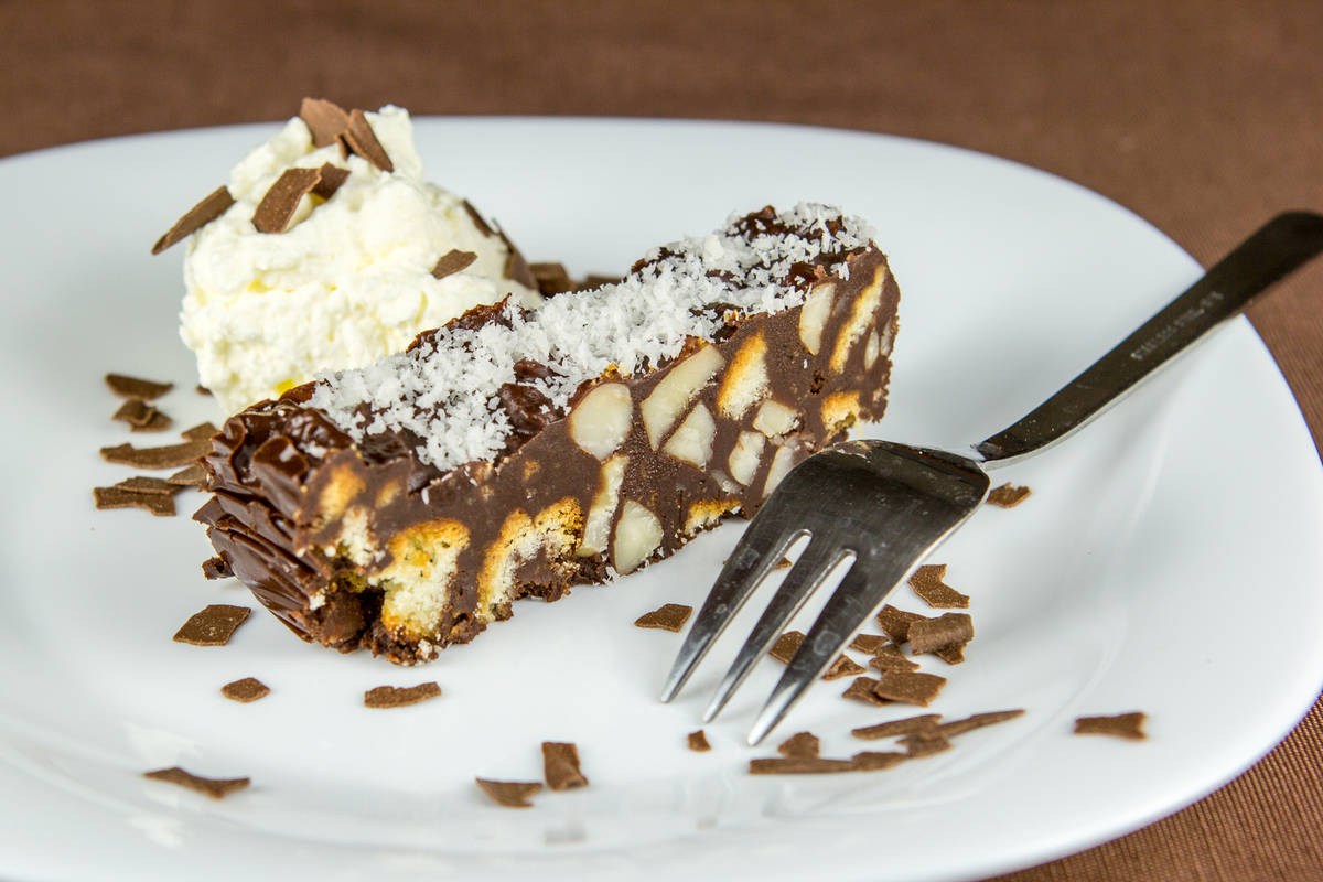 Vse skupaj damo v hladilnik za vsaj 2 uri. Nato pecivo prevrnemo na pladenj, potresemo s kokosom in narežemo na rezine.
