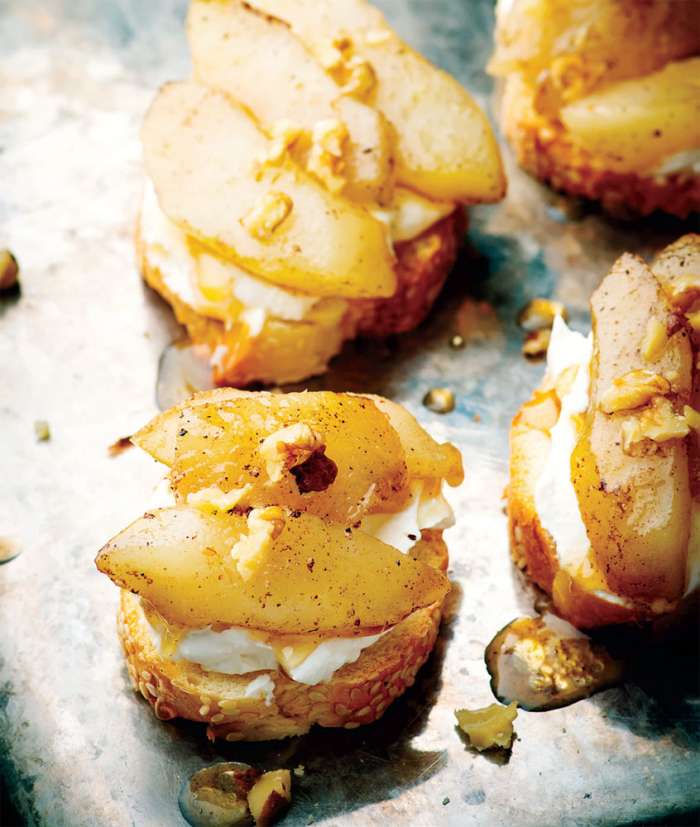 Vsako rezino obložimo z žlico skute, nekaj krhlji hrušk in posujemo z orehi.