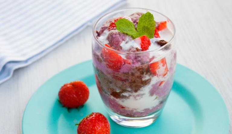 V kozarce po plasteh razporedite kakavovo mešanico, gozdnih sadežev, narezanih svežih jagod in kokosovo mleko. Ponovite dvakrat.