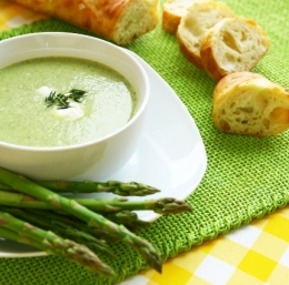 1 kg zelenih špargljev, 1 l zelenjavne juhe, 2 žlički jedilnega škroba, 50 g kisle smetane, ščepec sladkorja, sol, sveže mlet poper, žlico sesekljanega kopra.