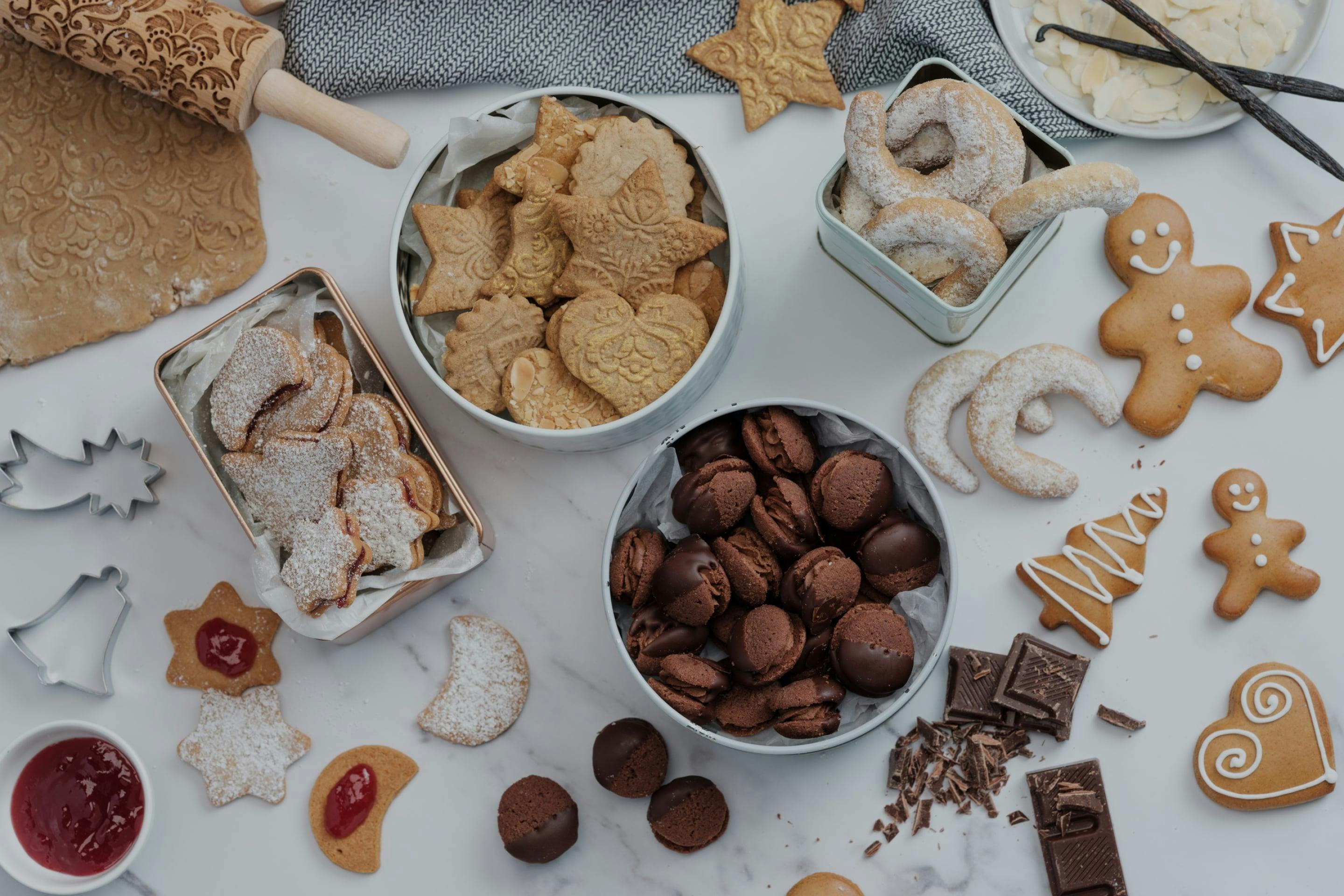 Če se želite pri okraševanju piškotov, kot so naši ingverjevi poljubčki, izogibati visoki vsebnosti sladkorja, lahko piškote pomočite v temno čokolado z visoko vsebnostjo kakava. Za še bogatejši okus lahko mešanici dodate dodatne začimbe, kot so cimet, kurkuma in ingver. Te začimbe lahko posebej vmešate v vse naše sladkorne ali čokoladne prelive.