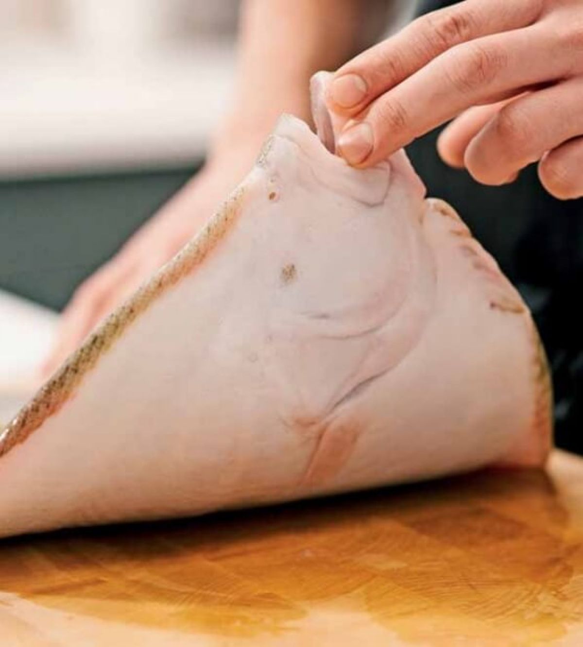 Fileji romba v mesu nimajo kosti, kožo pa je bolje odstraniti, saj je pečena precej trda. File položimo na desko s kožo navzdol, nato pa z nožem zarežemo kožo pri repu in odrežemo.