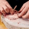 Filiranja romba se lotimo tako, da najprej zarežemo kožo nad hrbteničnim hrustancem in tik ob glavi.