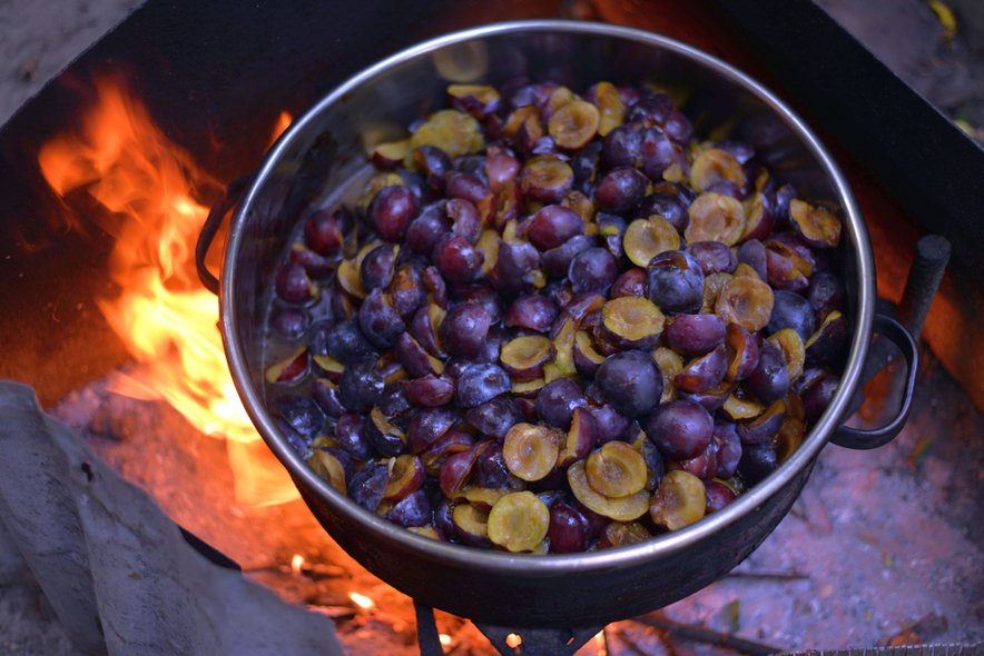 Sladkor se ni uporabljal, marmelada pa se je kuhala več urNajbolj znan star recept je za slivovo marmelado, ki so jo tradicionalno kuhali brez dodanega sladkorja. Na kose narezane slive so v velikem loncu kuhali dolgo časa, pogosto več kot 10 ur, dokler se sadna kaša ni sama od sebe zgostila. Marmelado so kuhali na nizkem ognju, kar je omogočilo karamelizacijo naravnih sladkorjev v sadju, kar je dalo marmeladi temnejšo barvo in bogatejši okus. Marmelado pa je bilo treba nenehno mešati z leseno lopatko, da se masa ni prijela dna lonca in zažgala. Mešanje je bilo tako pomembno, da so se družinski člani menli, medtem ko je nekdo drug skrbel, da ogenj ni ugasnil. Pena, ki se je oblikovala na površini, se je redno odstranja, saj bi lahko vplivala na okus in rok trajanja marmelade. Da se je marmelada hitreje zgostila, so za hitrejše zgoščevanje dodali kutine, jabolka in ponekod tudi bezgove jagode. Slednje so bile priljubljene za barvo in kot dodatek okusu, tako kot kutine in jabolka pa so drobne črne jagode tudi bogate s pektinom. To je bil preprost in povsem naraven trik, kako hitreje zgostiti marmelado brez dodajanja želatine ali drugih dodatkov, ki takrat še niso bili na voljo. Na kose narezane slive so v velikem loncu kuhali več ur. slika Priprava marmelade kot družabni dogodekKuhanje marmelade je bilo nekoč pomemben družabni dogodek, pri katerem je sodelovala vsa družina in pogosto tudi sosedje. Marmelado so kuhali v velikih loncih, običajno na prostem, njena priprava pa je vedno sledila sezonskemu ritmu, zato so jo delali, ko je bilo sadje popolnoma zrelo, najpogosteje pozno poleti ali zgodaj jeseni. Ponekod so za kuhanje marmelade uporabljali velike bakrene lonce, saj ti enakomerno prevajajo toploto in preprečujejo, da bi se sadna masa prijela. Po kuhanju so marmelado previdno prelili v sterilizirane kozarce, ki so jih pokrili oziroma zavili v debele odeje, da se je vsebina počasi ohladila.