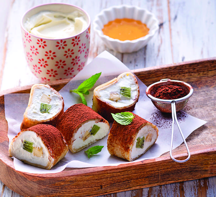 2 palačinki 250 g skute 1/2 zavoja vaniljinega sladkorja 1 žlica sladkorja 1 banana 1 kivi 1-2 žlici kakava