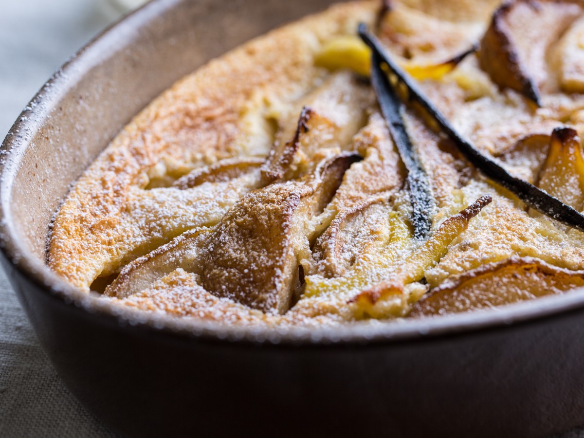 Hruške po želji olupimo, razpolovimo, odstranimo peške in narežemo na krhlje. Pekač namastimo in razporedimo hruške ter prelijemo s testom. Pečemo 30–35 minut oziroma dokler testo lepo ne naraste in se zlato zapeče. Pustimo stati 10 minut.