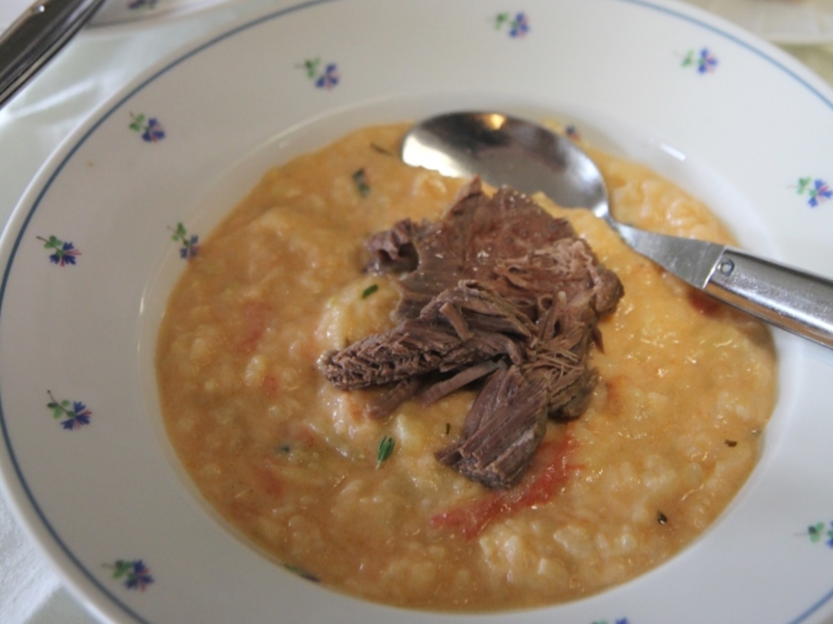 – 4 velike kumare – 4 krepki krompirji – 4 zajetne čebule – ¼ l paradižnikove šalše ali trije mogočni skuhani in olupljeni paradižniki – 3 stroki česna – 4 žlice oljčnega olja – 3 žlice kisle smetane – 1 dl mleka – sol, poper, bazilika, timijan – kuhana govedina iz juhe