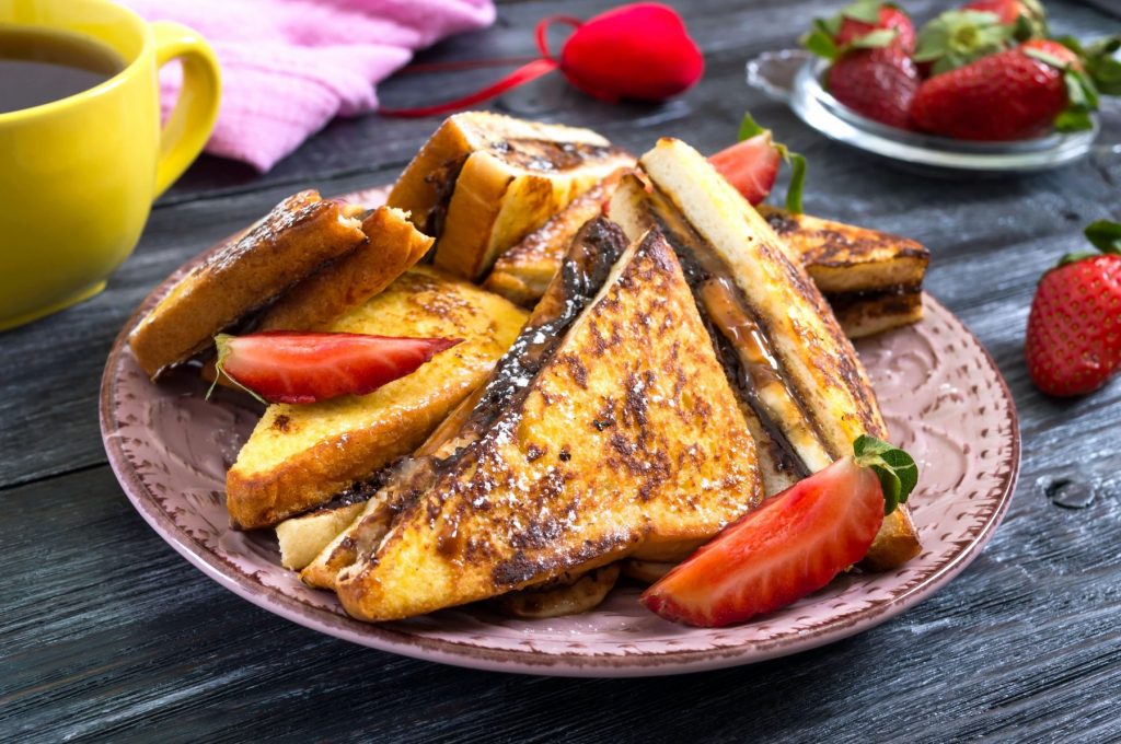 Na kose kruha namažemo Nutello in naredimo 4 sendviče. V plitvi posodi zmešamo jajci, mleko, sladkor in vaniljev ekstrakt.