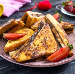 8 kosov postanega kruha po želji 8 žlic. Nutelle 2 jajci 240 ml mleka 2 žličk. vaniljevega ekstrakta 2 žlic. masla sladkor v prahu za posip sveže jagode ali drugo sadje