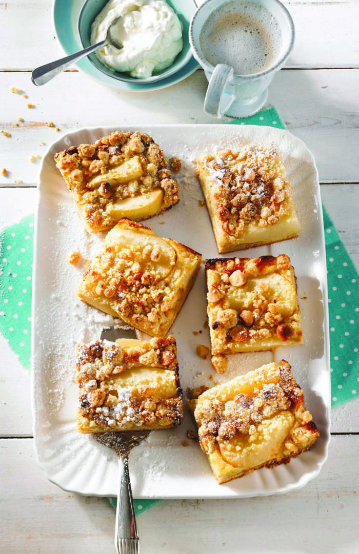 Testo namažemo z nadevom in obložimo s hruškami, potresemo s posipom in pečemo od 20 do 25 minut na 200 stopinjah.