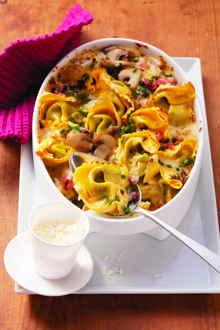 Gobovo mešanico s tortelini stresemo v pekač (velikosti 30 x 20 cm) in prelijemo s sirovo omako.
