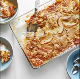 Pekač za 35 do 40 minut potisnemo v ogreto pečico. Med peko se bo testo dvignilo nad breskve in se bo po vrhu zlato rjavo zapeklo.