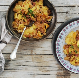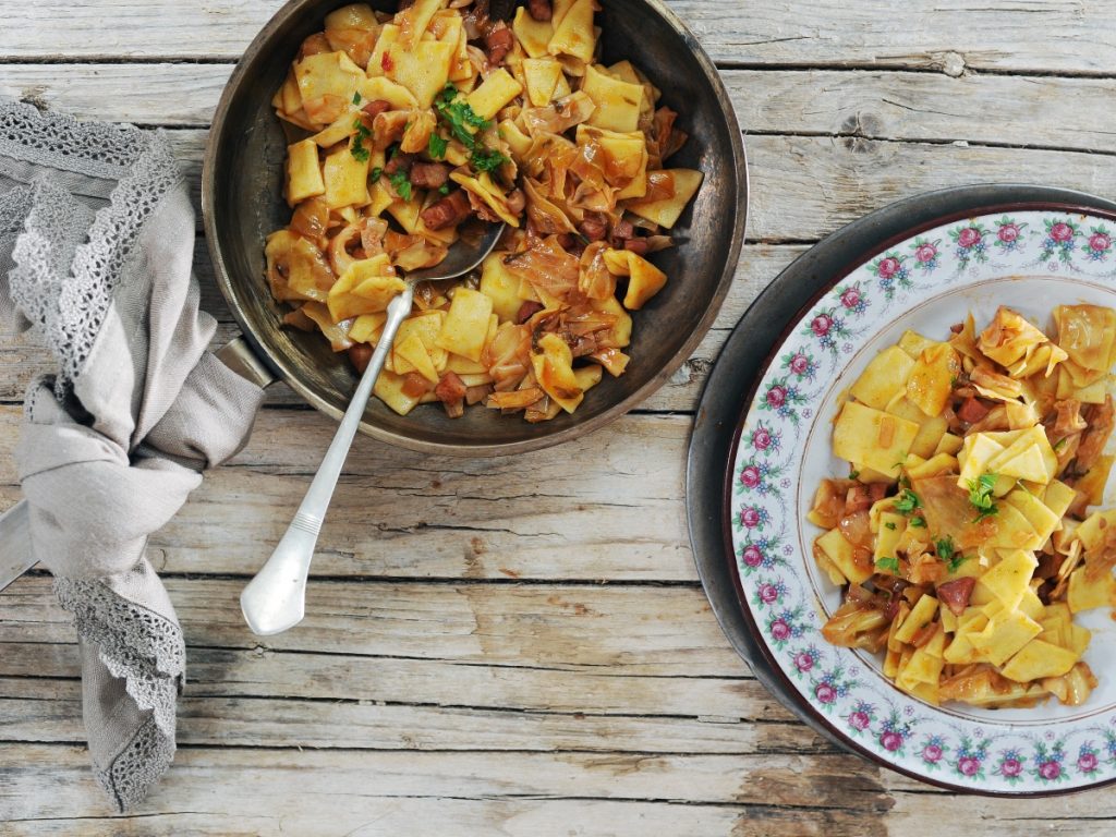 5. Krpice kuhamo v vreli slani vodi približno 3 minute, jih precedimo in vmešamo v sladko zelje. Postrežemo še toplo.