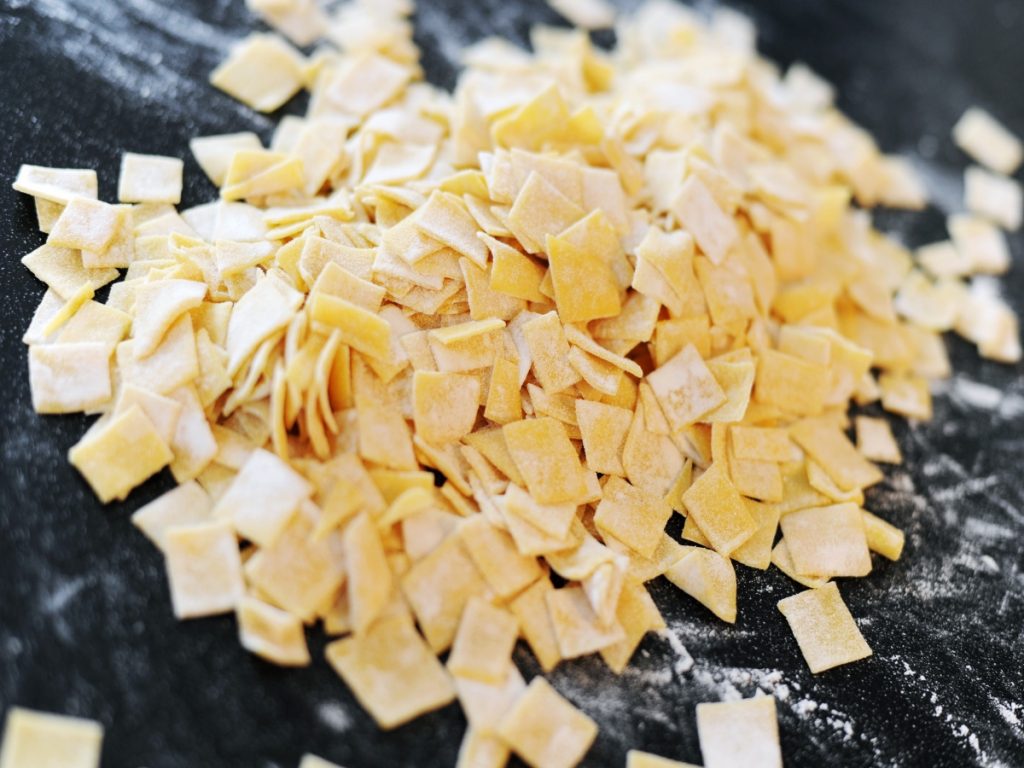 3. Testo razrežemo na centimeter velike krpice. Dobro jih pomokamo, da se nam ne sprimejo, in jih pustimo na pultu, dokler ni zelje skoraj gotovo. Krpice so sveže in zato ne bodo potrebovale več kot dve do tri minute kuhanja.