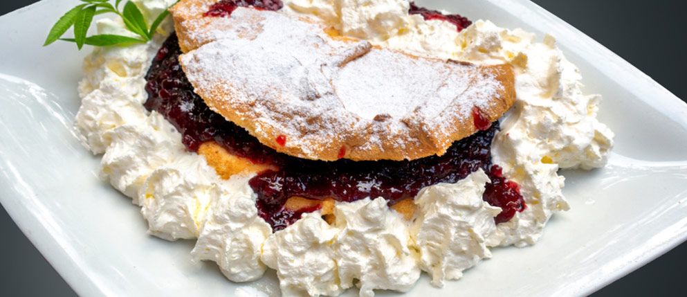 3 beljaki 3 rumenjaki 3 žlice moke 3 žlice sladkorja 3 žlice brusnične marmelade sladke smetane sladkorja v prahu Število serviranj: 2
