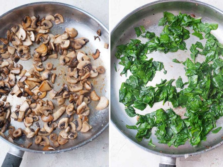 V prazno ponev stresemo špinačo. Le toliko, da se segreje in ovene. Stresemo jo na gobe. Sir naribamo na velike luknjice na strgalniku neposredno na špinačo. Začinimo s soljo in sveže mletim poprom in premešamo. Ko je gobarska sezona slabša, gozdne gobe mešamo z gojenimi. Odličen dodatek so suhi jurčki. Pa mlad, surov jurček, grobo nariban po zapečenih palačinkah.
