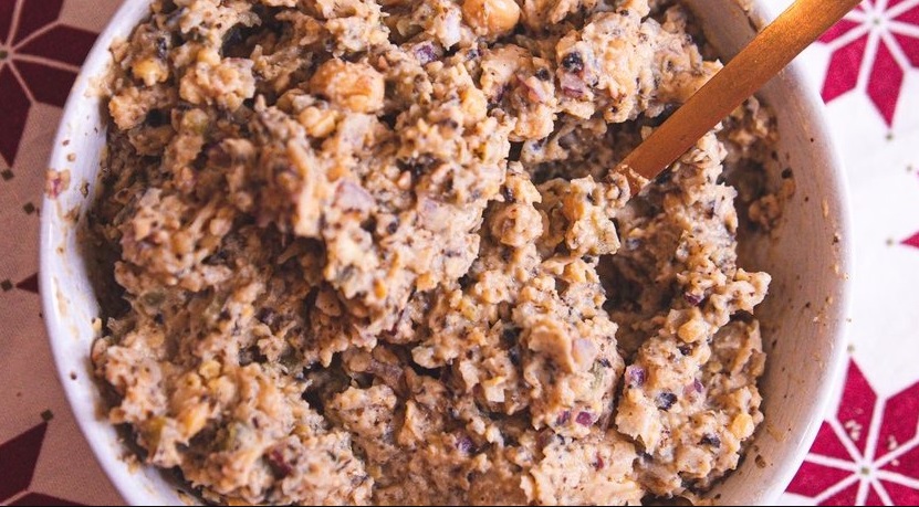 1 pločevinka čičerike (400 g) 2-3 žlice veganske majoneze 0,5 manjše rdeče čebule 3-4 kisle kumarice 0,5 lista posušene nori alge 1 žlica limoninega soka (ali 1 žlico tekočine vloženih kumaric) 1 žlica kvasnih kosmičev (zvrhana) 0,5 žličke soli 0,25 žličke črnega popra
