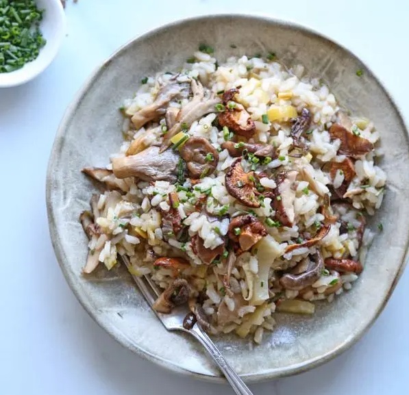 Drobnjak drobno narežemo. Polovico ga vmešamo k rižu in zelenjavi skupaj z gobami. Kuhamo še minuto, da se gobe ogrejejo.