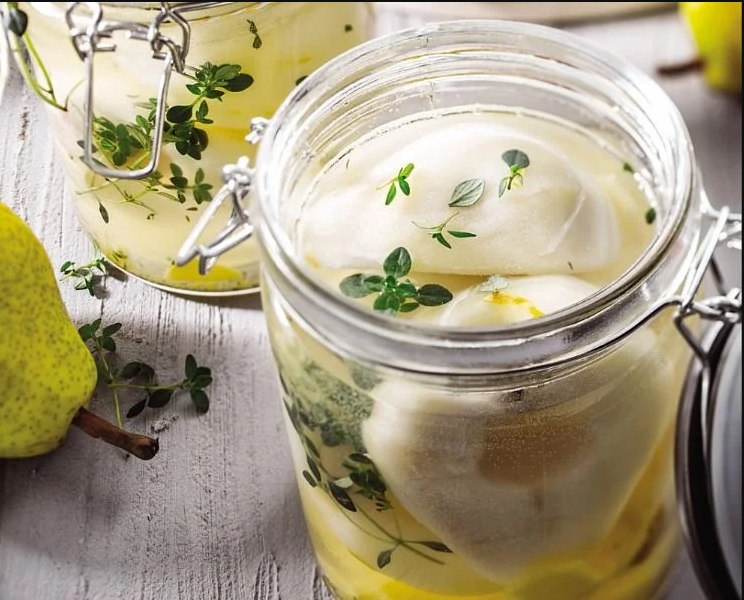 Količina: Za ca. 2 srednje velika kozarca za vlaganje 4 trde hruške kos ingverja 2 žlici sladkorja pol bio limone 20 ml jabolčnega kisa 500 ml vode limonin timijan