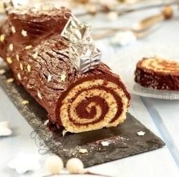 Božično deblo. Testo razgrnemo, namažemo s polovico kreme in zvijemo nazaj v rolado. Preostalo kremo zdevamo v brizgalno vrečko, potem pa z njo po roladi nabrizgamo podolžne črte, da dobimo obliko kosa debla.