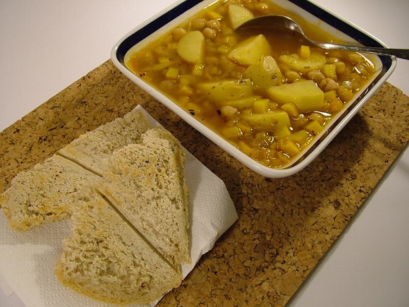 2 čebuli 3 krompirji 3 zajemalke čičerike 1 korenček začimbe (sol, poper, česen, paprika, čili ...) kapljica olja