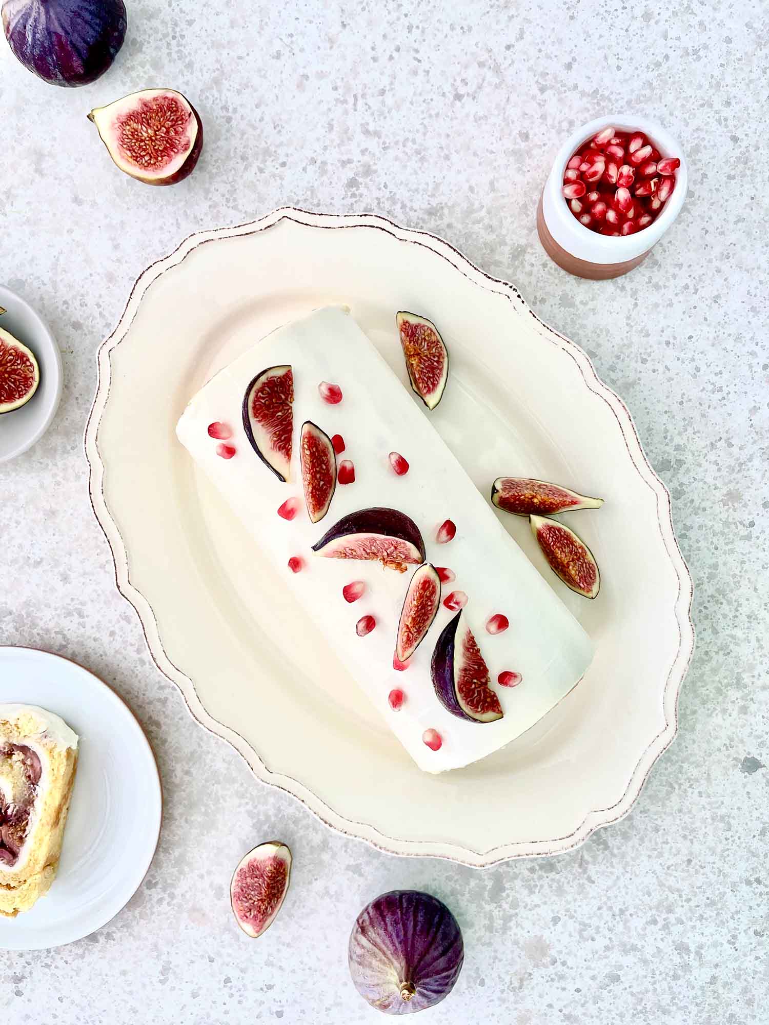 Ohlajeno rolado premažemo s preostankom kreme in jo okrasimo s svežimi figami in s semeni granatnega jabolka.