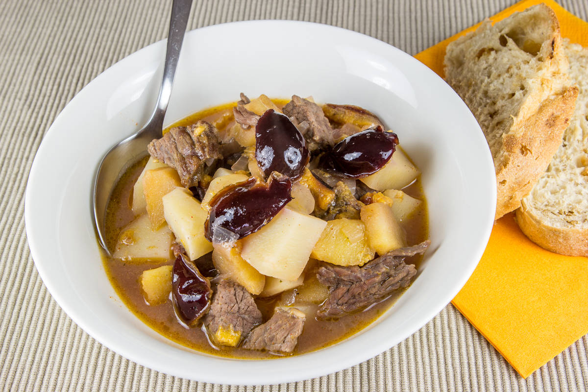 800g Govedina - file 3dl Svež jabolčni sok Mleta rdeča paprika 400g Slive - sveže 500g Čebula 50g Maslo Sol Poper 2dl Zelenjavna juha 600g Krompir 2 kosa Jabolka