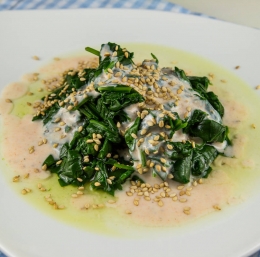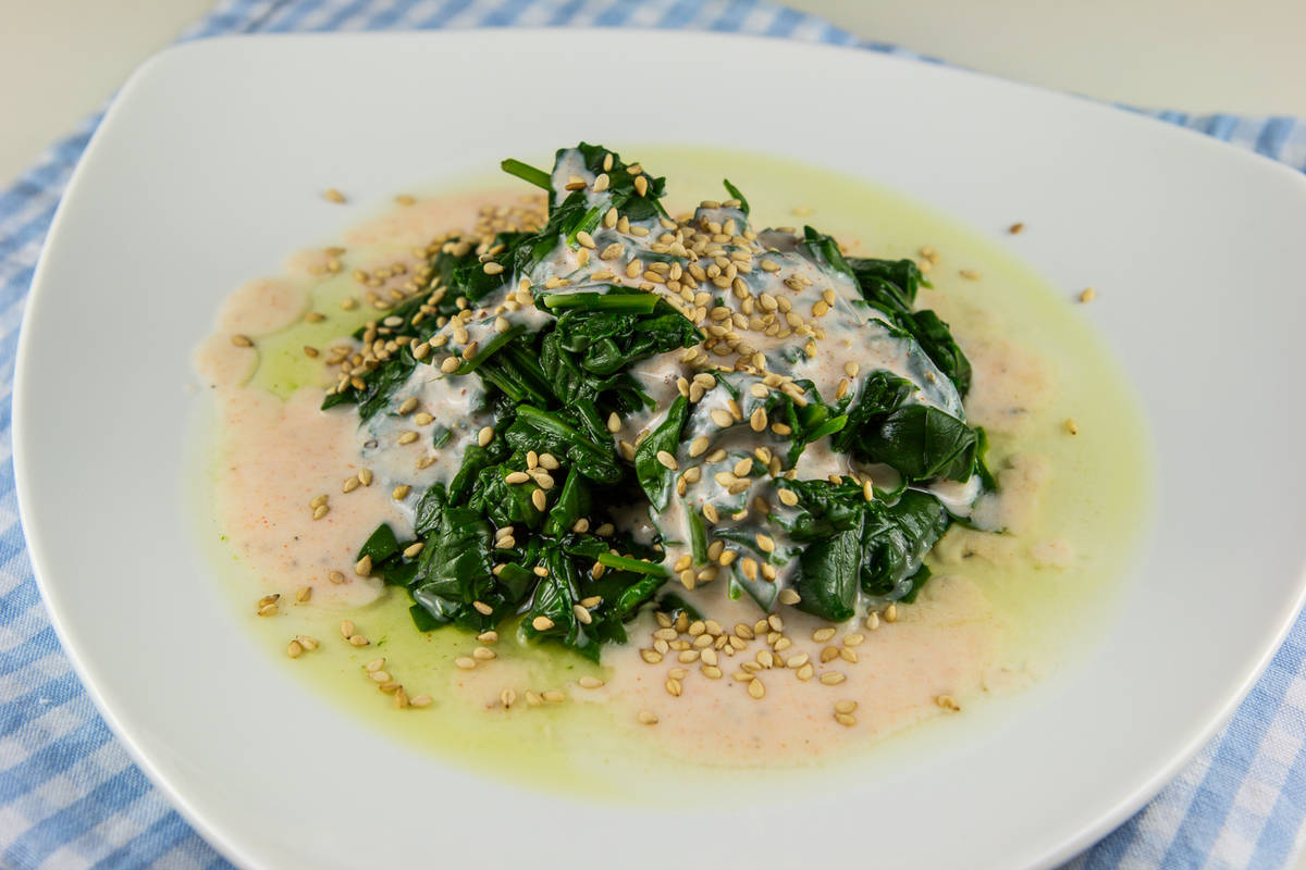 Ohlajeni špinači dodamo sezam in prelijemo z jogurtom.
