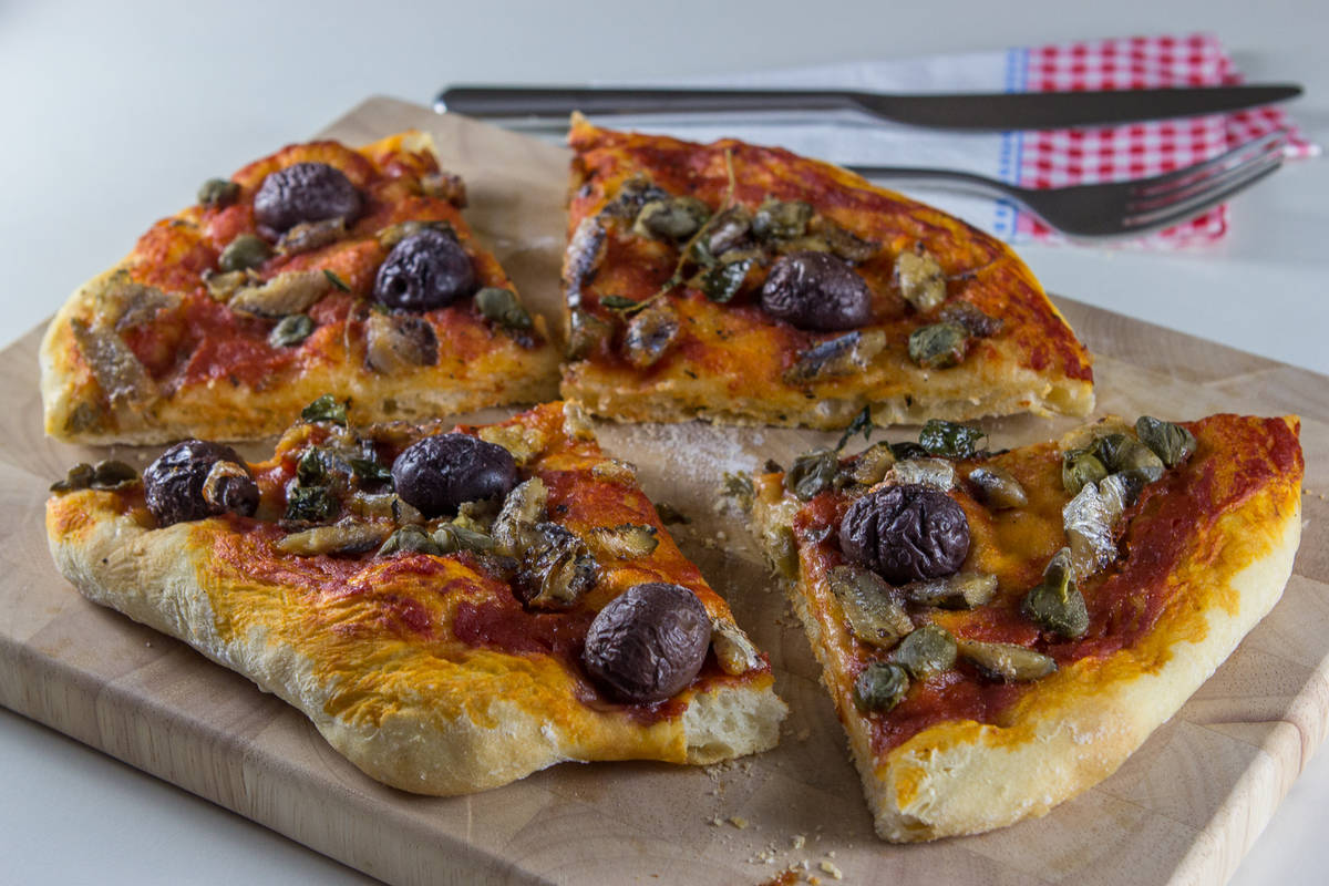 Omako premažemo po testu in obložimo s fileji sardin, kaprami in olivami. Solimo, popramo in potresemo z origano.