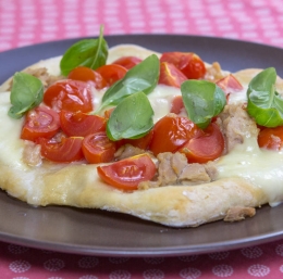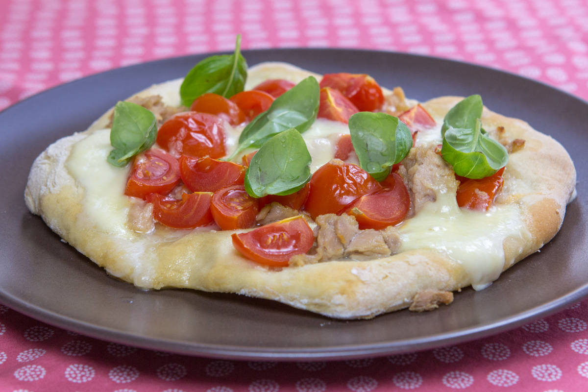 Nato ga pokapljamo z tuninim oljem, obložimo s tunino, mocarelo, paradižnikom, solimo in popramo.