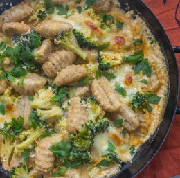 V pekač stresemo kuhane njoke in brokoli. Prelijemo s pripravljeno omako in dodamo še preostalo mocarelo.