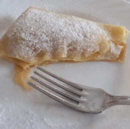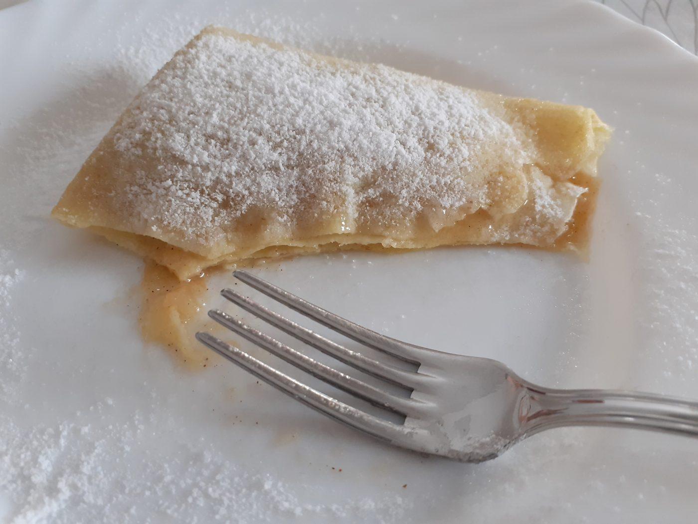 Vzamete palačinko, jo na polovici nadevate s kuhano jabolčno omako, prepognete in posujete z mletim sladkorjem ali stopljeno čokolado.