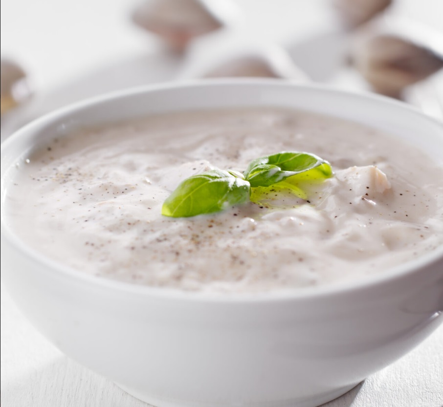 Za 4 porcije 1.5 kg očiščenih školjk 50 g masla 150 g mesnate slanine 1 čebula nekaj vejic svežega timijana 1 lovorjev list 1 žlica moke 150 ml mleka 150 ml smetane sol in sveže mleti poper 2 žlici sesekljanega peteršilja
