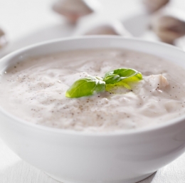 Popražene sestavine potrosimo z moko in vse skupaj med nenehnim mešanjem pražimo še 2 minuti, potem pa prilijemo školjčno osnovo. Dobro premešamo, da se tekočina lepo zmeša z moko in popraženimi sestavinami, potem pa v lonec prilijemo še mleko in smetano. Krompir olupimo, operemo in narežemo na majhne kocke, ki jih dodamo v lonec.