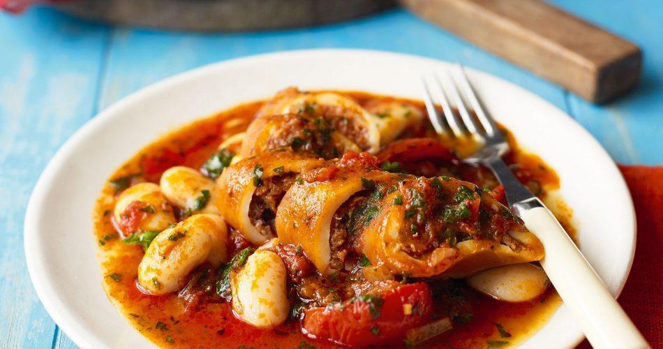 Sipe čistimo. Na oljčnem olju prepražimo čebulo in sardone, nato dodamo na drobno sesekljan česen, sesekljane eferone in sipe.