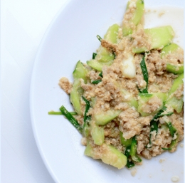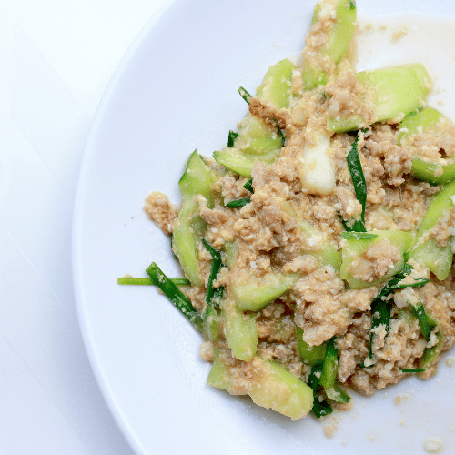 Na kokosovem olju popražite na hitro sesekljano čebulo in dodajte še na kocke narezano bučko.