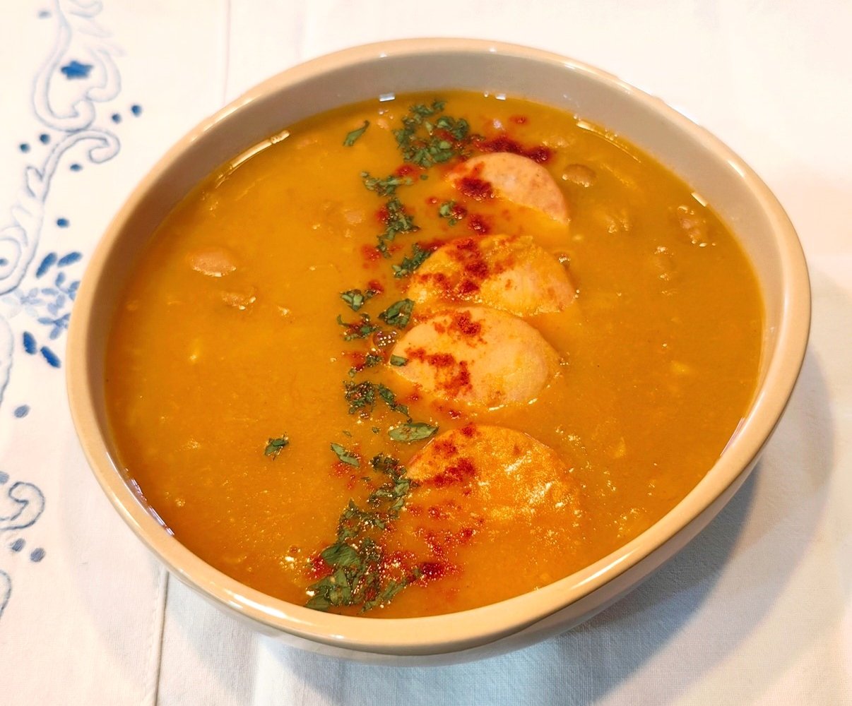 Dodamo mleto papriko in paradižnikovo mezgo. Malo premešamo in dodamo obe pločevinki fižola skupaj s tekočino ter pol litra vode. Dobro premešamo. Dodamo lovor in poper. Ko zavre, naj se kuha še 10 minut.